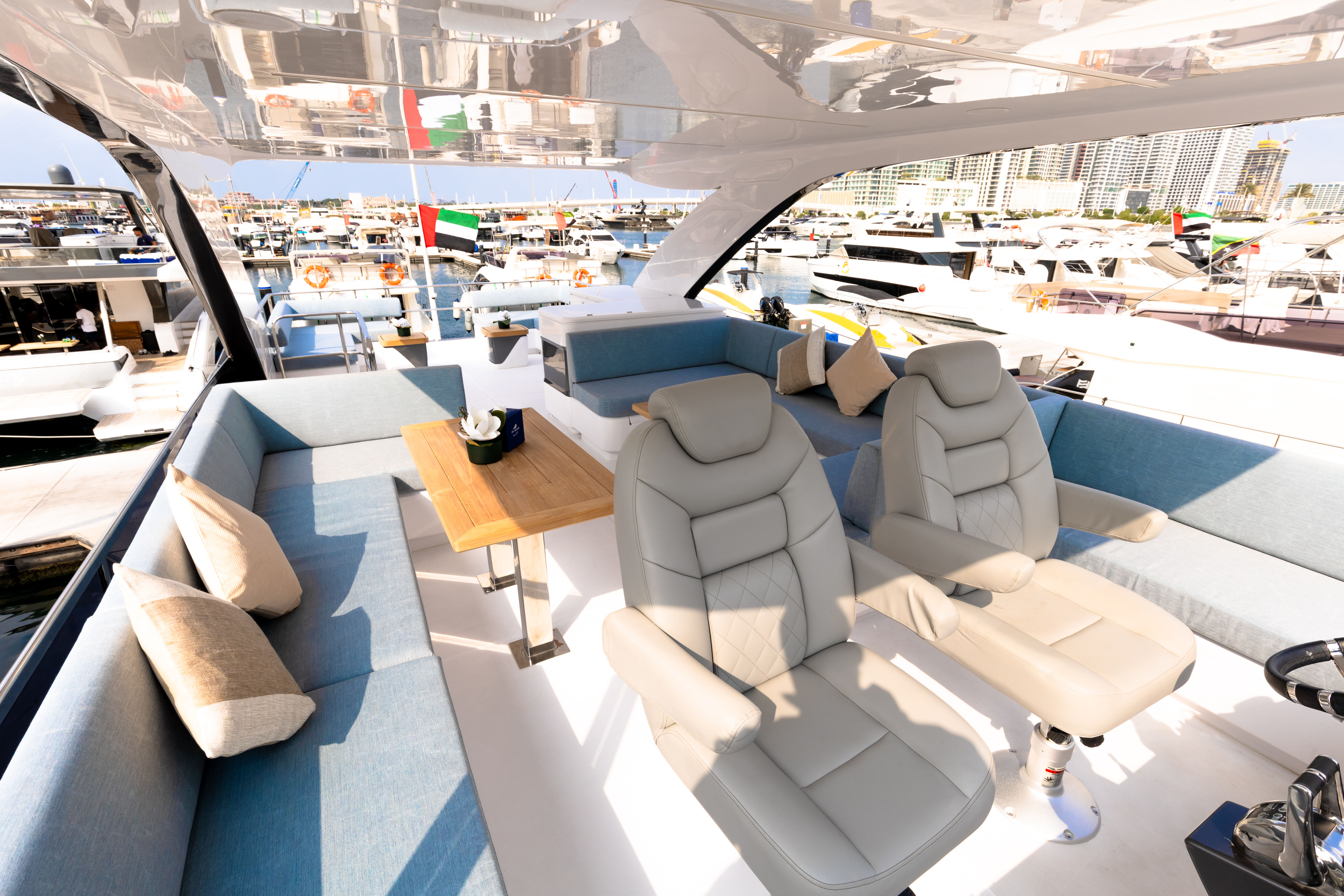 In addition to the classic indoor helm station on the main deck, the salon area is equipped with wraparound sofa.